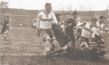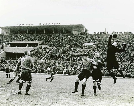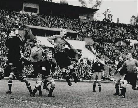 На фото: «Динамо» - «Торпедо», 12 мая 1946 г. Динамовцы В. Радикорский, М. Семичастный и И. Станкевич помогают А. Хомичу защищать ворота от атаки А. Севидова и В. Панфилова