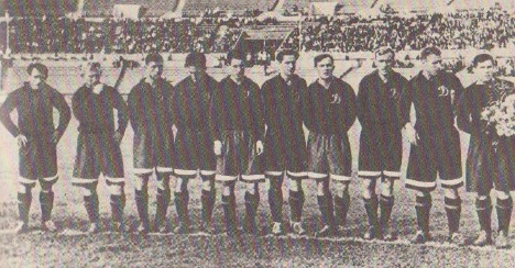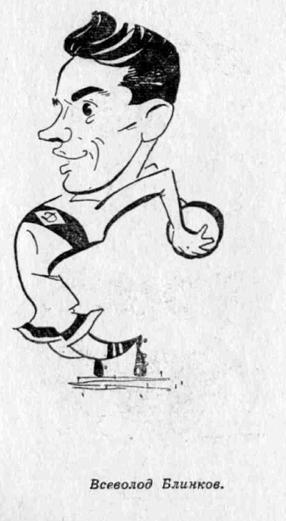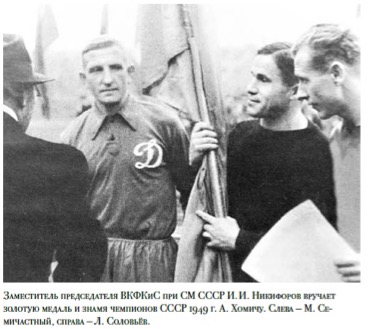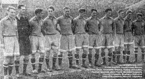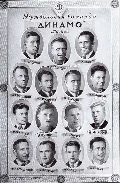 На фото: 1947 г. «Динамо» (Москва). В.Трофимов, А.Малявкин, В.Ильин, С.Соловьёв, В.Блинков, В.Савдунин, А.Петров, Е.Архангельский, Л.Соловьёв, А.Хомич.