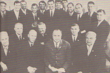 На фото: 1971 г. Верхний ряд: Л.Иванов, А.Акимов, О.Макаров, А.Хомич, В.Маслаченко, Л.Яшин, В.Пильгуй, Б.Разинский, Е.Фокин, В.Набутов, В.Никаноров, А.Квасников. Нижний ряд: Ф.Чулков, Г.Шорец, Н.Соколов, А.Леонтьев, В.Гранаткин, А.Идзковский, М.Леонов. Снимок сделан после прощального матча Льва Ивановича Яшина.