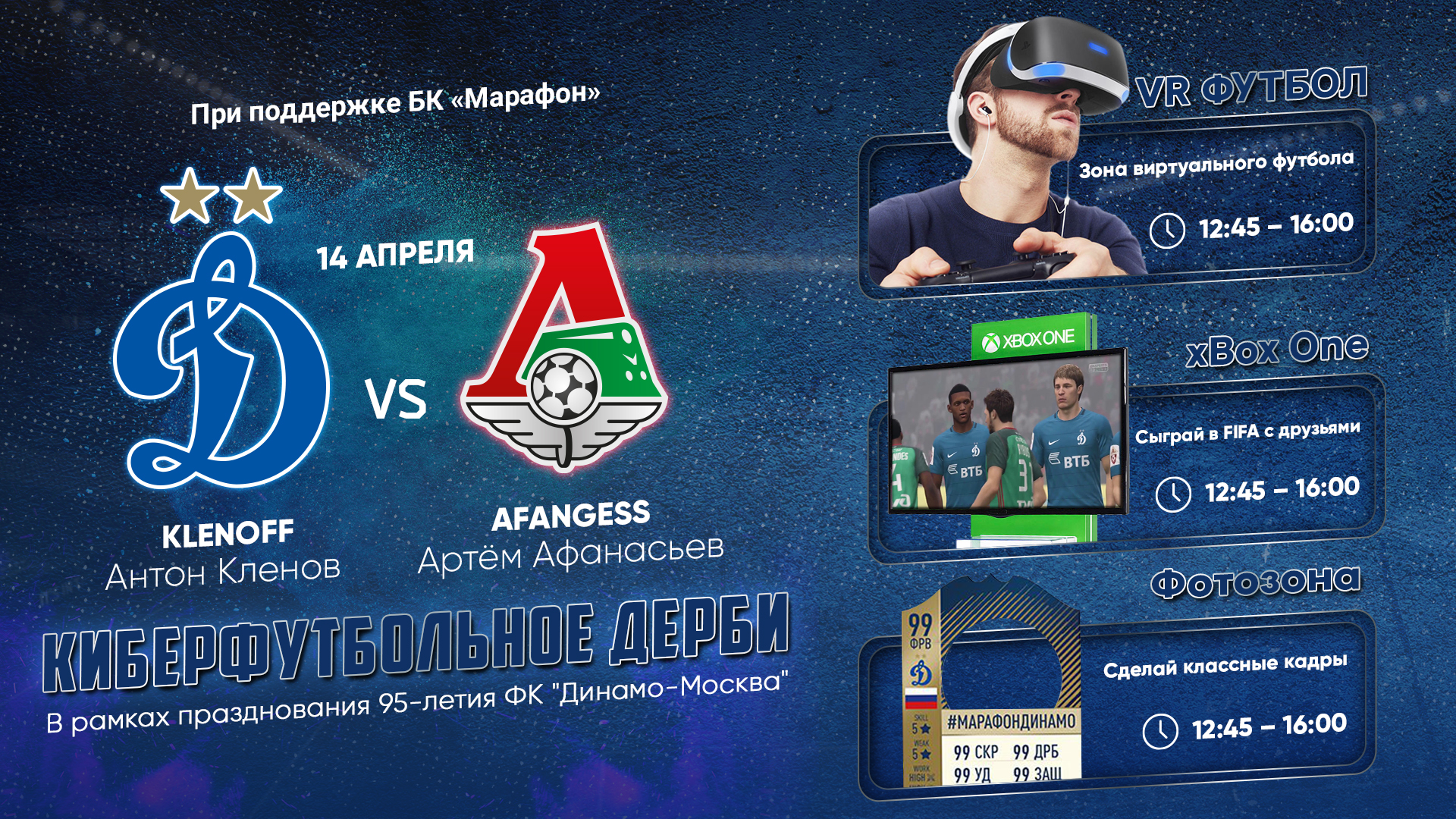 13.00 – 13.45 - серия из трех матчей между Антоном Klenoff Кленовым («Динамо») и Артемом AfanGess Афанасьевым («Локомотив»). Не забудьте сделать прогноз на их игру и выиграть приз