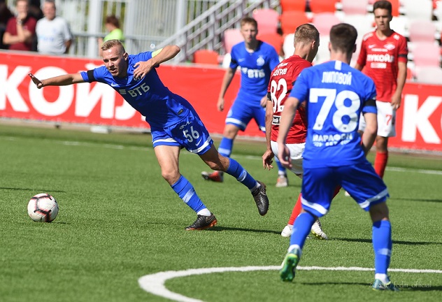 И оно могло случиться, если бы бело-голубые сразу забили ответный мяч. Денисов прорвал оборону соперника слева, ворвался в штрафную и успел катнуть мяч мимо голкипера – жаль, первым успел на него защитник хозяев. На 65-й минуте динамовский сектор охнул от невезения. Мазурин в штрафной разобрался с двоими, выкатил мяч вдоль точно на набежавшего Лацевича, который метров с 11 плотно зарядил выше. В рядах нашей молодёжки заметен был и вышедший на замену Гоманюк. Илья раз за разом раскидывал финтами оппонентов, но до выверенного последнего паса дело доходило не всегда. В концовке матча, не желая мириться с сухим поражением, динамовцы ещё больше прибавили, и вот уже Шитов вытащил сложный мяч, пущенный Гоманюком. Затем Лацевич с Денисовым попеременно наносили удары по воротам, но снаряд упорно шёл мимо створа. Заключительный интересный эпизод в малом дерби был связан с именем активного Гоманюка, чей опасный удар обезвредил Шитов. В итоге 0:2, бело-голубые терпят поражение во встрече со «Спартаком», которое отбрасывает нашу команду за пределы призовой тройки.